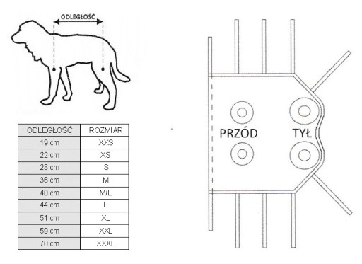 Dla określenia właściwego rozmiaru ubranka istotny jest pomiar odległości między środkami przednich i tylnych kończyn zwierzęcia – wysokość i tęgość nie mają znaczenia. Aby dopasować jeden z 9 oferowanych przez nas rozmiarów.