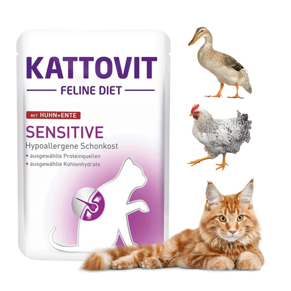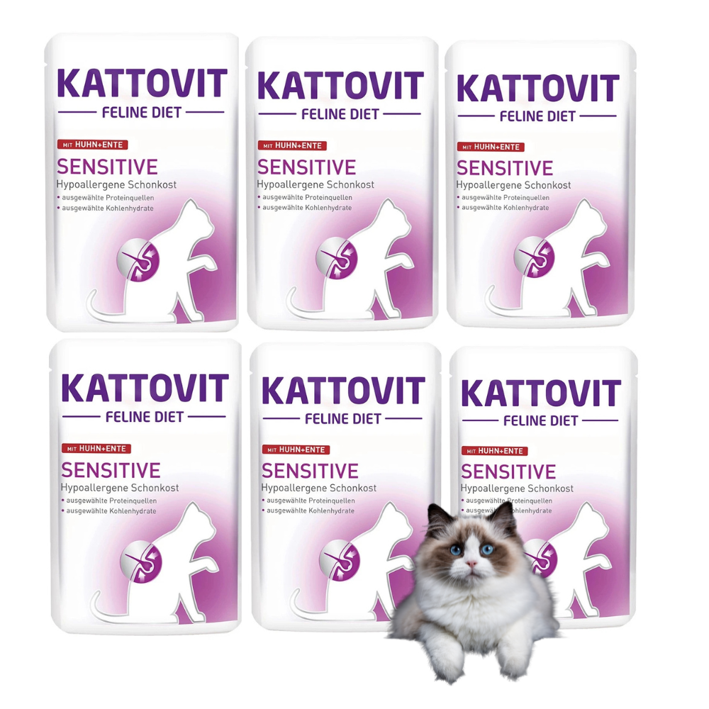 Kattovit Sensitive Kurczak Indyk to pełnowartościowa mokra karma stworzona specjalnie dla kotów z wrażliwym układem pokarmowym oraz skłonnościami do alergii. Nietolerancje pokarmowe i alergie mogą prowadzić do nieprzyjemnych objawów, takich jak problemy skórne, sierściowe czy trawienne. Kattovit Sensitive pomaga łagodzić te objawy, eliminując najczęstsze alergeny, takie jak zboża, i zapewniając lekkostrawne źródła białka pochodzące z kurczaka i kaczki.
