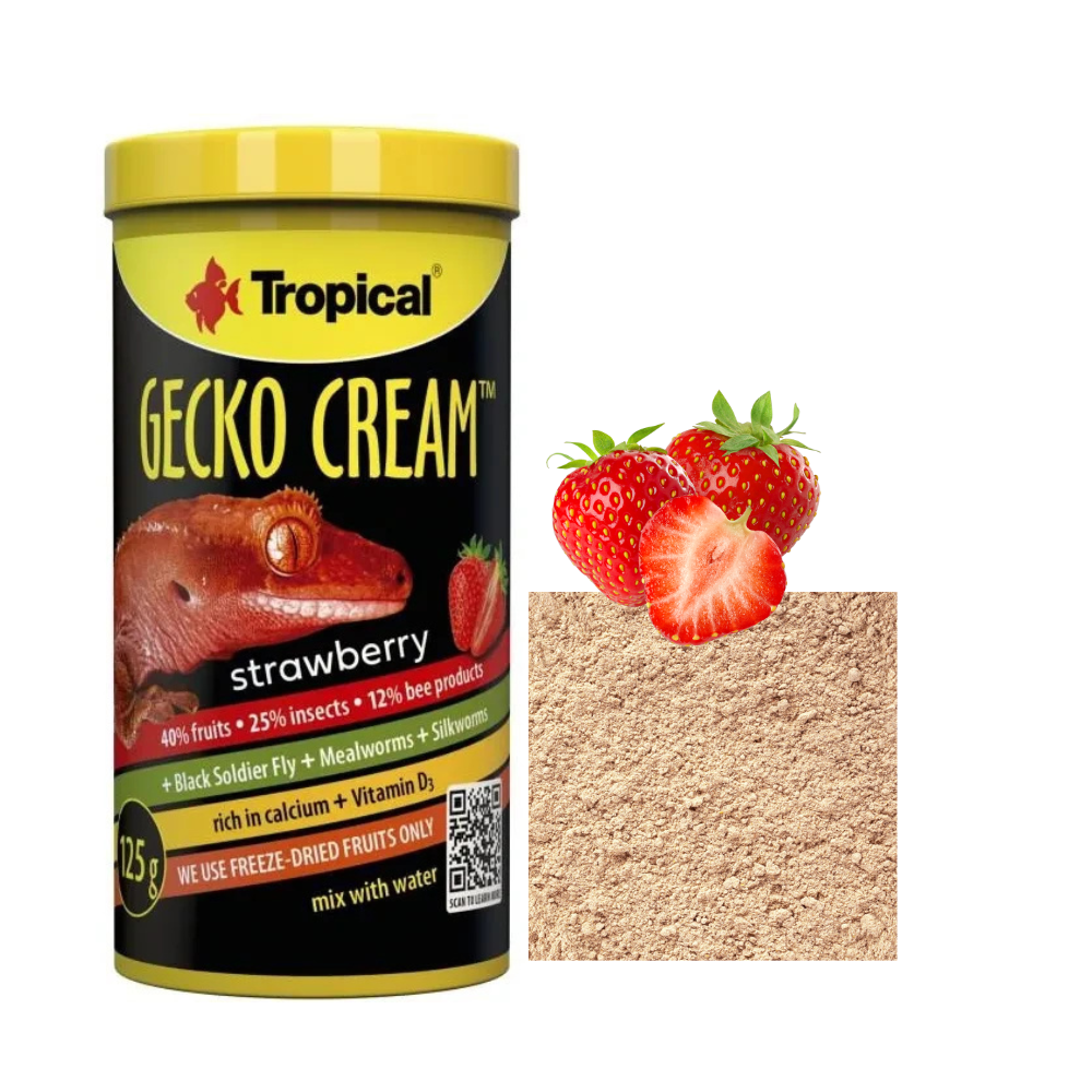 Wieloskładnikowy pokarm w proszku, idealny do przygotowania musu, dedykowany gekonom orzęsionym, gargulcowym, omszałym oraz innym owoco-owadożernym gadom. Zawiera aż 40% liofilizowanych owoców (truskawka, banan, ananas, figa), które nadają pokarmowi świeżość i bogaty smak, oraz 25% owadów, które dostarczają cenne białko o pełnym profilu aminokwasowym.