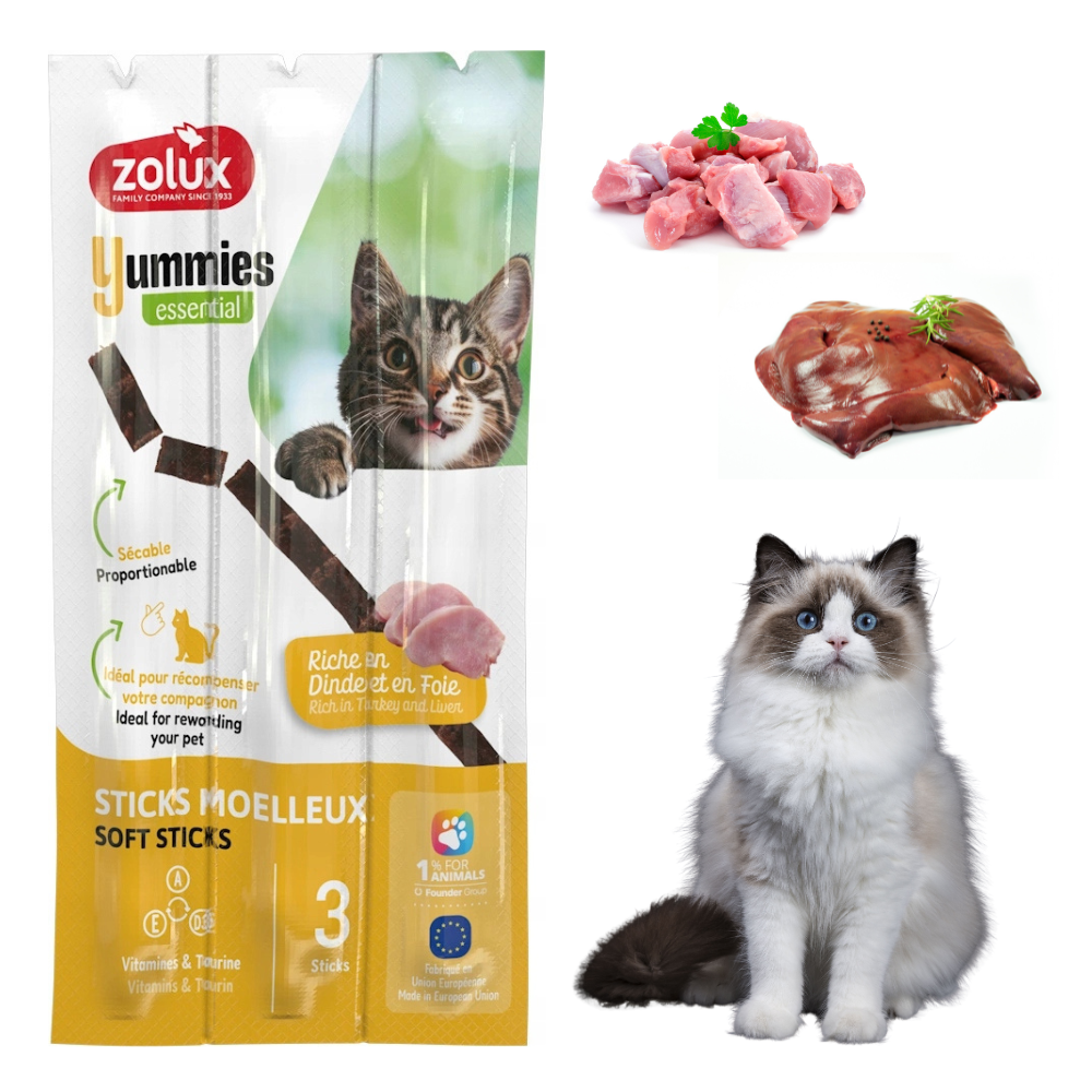 Szukasz wyjątkowo smacznych i zdrowych przysmaków dla kota? Sięgnij po ZOLUX YUMMIES Pałeczki z indykiem i wątróbką! Miękkie, aromatyczne i pełne mięsa – aż 90% składników pochodzenia zwierzęcego, w tym 28% indyka i 14% wątróbki. Dodatek tauryny i witamin wspiera serce, wzrok i ogólną kondycję Twojego pupila.