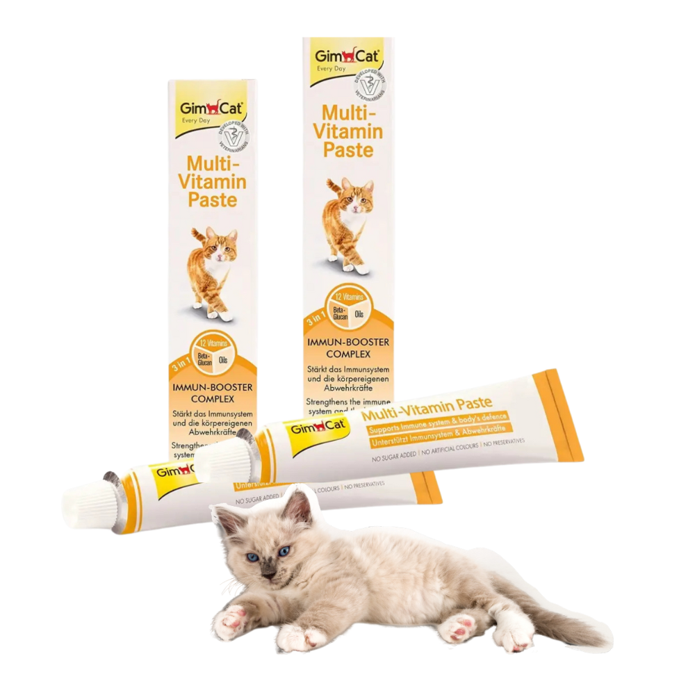 - Wzmocnienie odporności – Pasta GimCat MultiVitamin zawiera aż 12 kluczowych witamin (m.in. D3, E, B-kompleks, biotyna), które wspomagają naturalne mechanizmy obronne organizmu i chronią kota przed infekcjami.